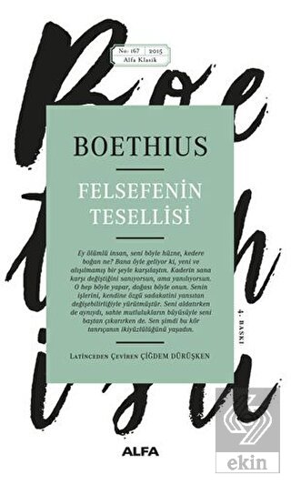 Vatan haini suçlamasıyla, yargılanmaya bile gerek görülmeden bir zindana atılan ve idamını bekleyen Romalı filozof, Boethius'un tanrısal öngörü, kader ve özgür irade üzerine sorgulamalarını içeren en önemli yapıtıdır Felsefenin Tesellisi. Pagan dünyanın düşünsel öğretileri ile ortaçağın Hıristiyanlık düşüncesinin tam eşiğinde duran Romalı bir filozofun Felsefe'yle yaptığı iç hesaplaşmasına Felsefe'nin kendi dilinden tanık olma şansını yakaladığımız görkemli bir yapıttır. Antikçağ Yunan felsefesinden, yeni-Platonculuktan, Latin edebiyatından seçilen düşüncelerin seçkin bir karması ve filozofun gününe değin felsefe tarihinde başat rol oynayan Platon'un ve Aristoteles'in konuyla ilgili görüşlerinin şiirsel bir özetidir. Bu yapıt için belki de tek şey söylenebilir: inanç ile aklın muhteşem dansı.