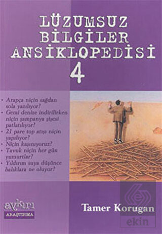 Aykırı klasiği Lüzumsuz Bilgiler Ansikpoledisi'nin bu dördüncü kitabında bu kez 90 sorunun yanıtları var. Sorular ilginçliğinden bir şey kaybetmiyor ama yanıtlar bu kitapta biraz daha etraflı sunuluyor. Böylece bundan önceki üç kitapta yer alan 388 soruyla birlikte toplam 478 lüzumsuz sorunun lüzumsuz yanıtlarına sahip oluyorsunuz! İşte dördüncü kitaptaki sorulardan bazıları: