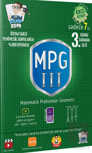 "Nedir bu MPG?" diye sorduğunu duyar gibiyiz. MPG fasiküllerimiz Matematik, Problemler ve Geometri sorularından oluşuyor. TYT MPG serimiz, ÖSYM'nin yeni tarzdaki soruları ile birebir uyumlu ve güncel sorulardan oluşuyor. Fasikülün Problemler kısmında ise, rutin olmayan problemlerin en seçkin örnekleri ile karşılaşacak ve eksiklerini tamamlayacaksın!