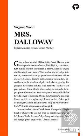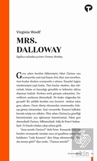 Clarissa Dalloway ve Septimus Warren Smith. Hiç karşılaşmamış ama hikayeleri bir şekilde iç içe örülmüşiki insan. Virginia Woolf, bilinç akışı tekniğiyle yazdığı benzersiz romanı Mrs. Dalloway'de zamanı eğip bükerek ve hayatı yaşandığı gibi değil hatırlandığı gibi anlatarak okuru, karakterlerinin zihninde bir yolculuğa çıkarıyor.