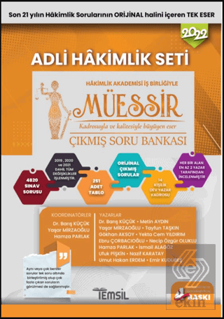• Her yeni baskıda kalitesini daha da artırmayı hedefleyen MÜESSİR Hâkimlik Çıkmış Soru Bankası, 2021 baskısını İlkuzem (Hakimlik Akademisi) iş birliği ile ortaya çıkarmış, 14 kişilik dev yazar kadrosuyla içeriğinde de genişlemeye gitmiştir. Her bir bölüm en az 2 yazar tarafından incelenip kontrol edilmiştir.